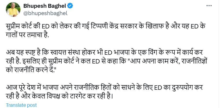वहीं बघेल ने आगे लिखा, इसलिए ही सुप्रीम कोर्ट ने कल ED से कहा कि आप अपना काम करें, राजनीतिज्ञों को राजनीति करने दें। आज पूरे देश में भाजपा अपने राजनीतिक हितों को साधने के लिए ED का दुरुपयोग कर रही है और केवल विपक्ष को टारगेट कर रही है।