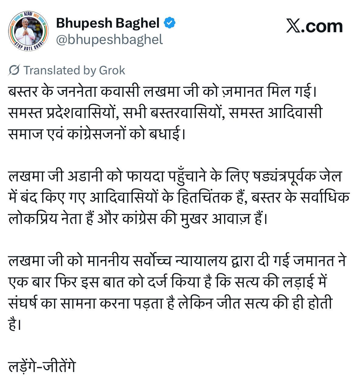 वहीं लखमा को अंतरिम जमानत मिलने के बाद पूर्व मुख्यमंत्री भूपेश बघेल ने कहा कि कवासी लखमा को सर्वोच्च न्यायालय द्वारा दी गई जमानत ने एक बार फिर इस बात को दर्ज किया है कि सत्य की लड़ाई में संघर्ष का सामना करना पड़ता है, लेकिन जीत सत्य की ही होती है।