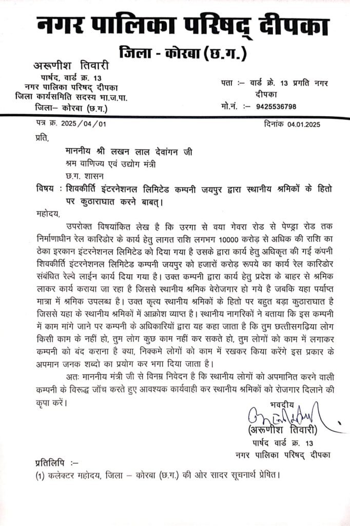 कोरबा/दीपका। नगर पालिका परिषद वार्ड क्रमांक 13 के पार्षद एवं भाजपा नेता अरूणीश तिवारी ने मंत्री लखनलाल देवांगन को ज्ञापन सौंपकर बताया कि रेल कारीडोर के कार्य में ठेका कंपनी शिवकीर्ति इंटरनेशनल लिमिटेड द्वारा स्थानीय युवा बेरोजगारों की उपेक्षा कर बाहर से मजदूर मंगाकर काम करा रही है।