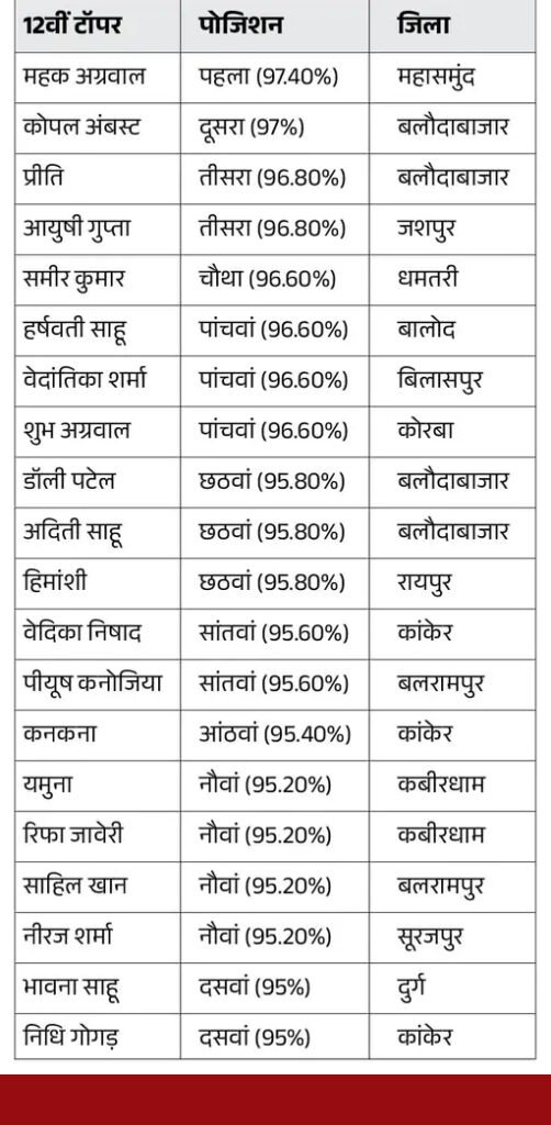 12वीं में 2 लाख 61 हजार 77 छात्र परीक्षा के लिए रजिस्टर्ड हुए थे। इनमें 2 लाख 58 हजार 704 छात्रों ने परीक्षा दी है। इनमें 83.72 फीसदी छात्राएं और 76.91 छात्र पास हुए हैं। बलौदाबाजार जिले के 4 छात्र टॉप 10 में शामिल हैं। 12वीं की परीक्षा 1 मार्च से 23 मार्च तक हुई थी।