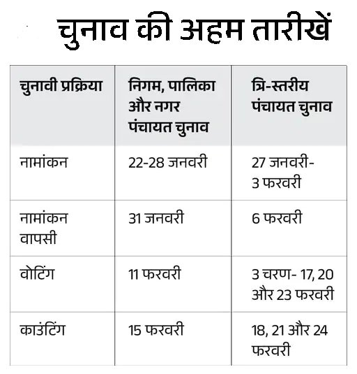 निर्वाचन आयोग ने पंचायत चुनाव की भी घोषणा कर दी है। 3 चरण में 17, 20 और 23 फरवरी को पंचायत चुनाव के लिए मतदान होगा। इसके नतीजे 18, 21 और 24 फरवरी को आएंगे। त्रि-स्तरीय पंचायत चुनाव बैलेट पेपर से होंगे। राज्य निर्वाचन आयोग के आयुक्त अजय सिंह चुनावी तारीखों की जानकारी दी। उन्होंने कहा कि, आचार संहिता का उल्लंघन ना हो इसके लिए जिलों में अलग से टीम बनाने का निर्देश जारी किया गया है। आज 20 जनवरी को चुनाव घोषणा के बाद से 24 फरवरी तक आचार संहिता लागू रहेगी।