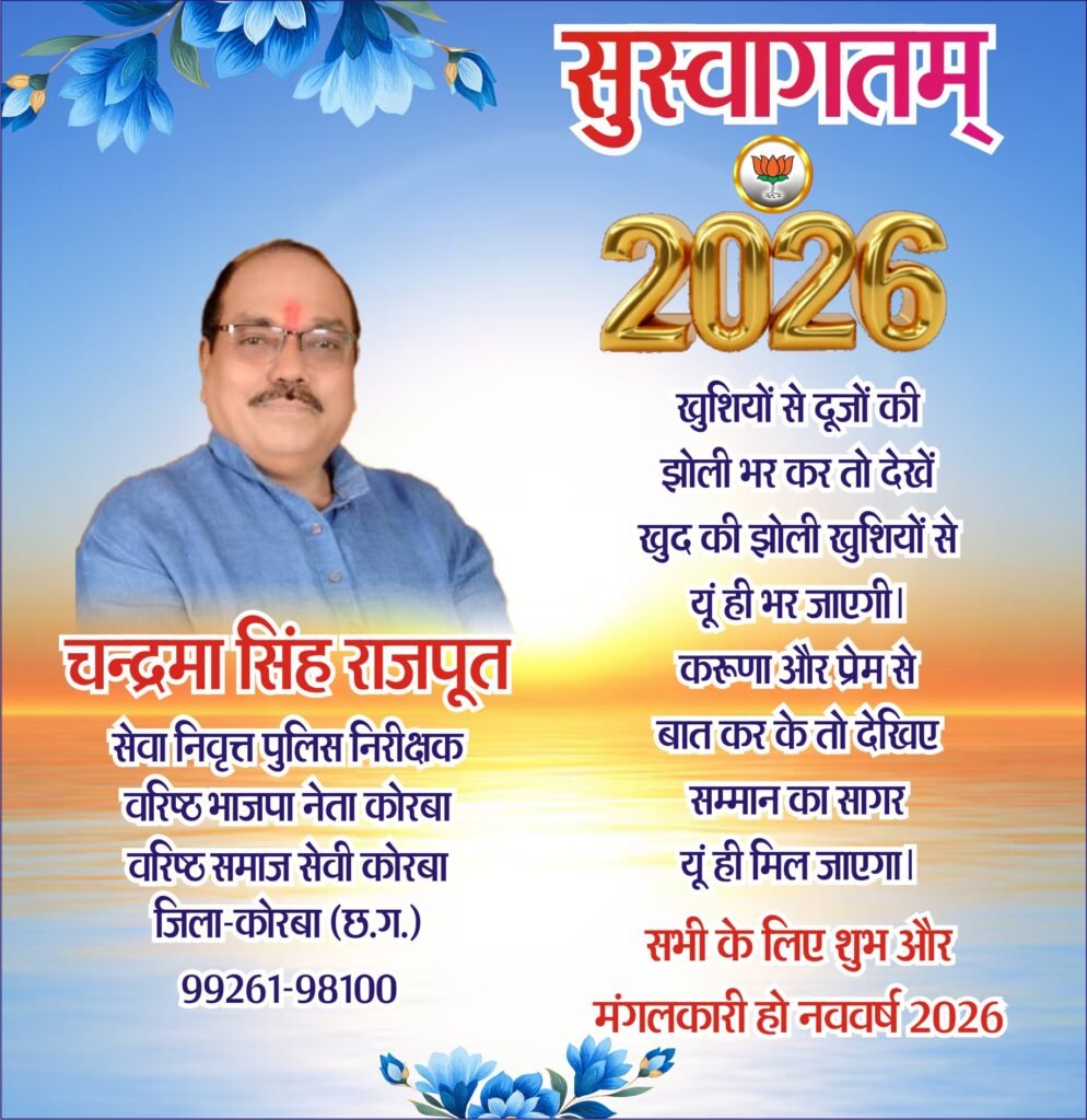 कोरबा। कोरबा की प्रथम नागरिक महापौर श्रीमती संजूदेवी राजपूत ने जिलेवासियों को नववर्ष 2026 की बधाई दी है। महापौर ने अपने शुभकामना संदेश में कहा है कि नया साल सभी के जीवन में नई खुशियों, समृद्धियों की सौगात लेकर आए और सबके जीवन में उल्लास का रंग भरे। नया वर्ष हम सबको नया कुछ सिखाए… एकता, सद्भाव का पाठ पढ़ाए।