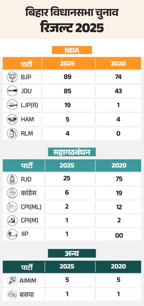 दरअसल कांग्रेस ने इस चुनाव में 60 सीटों पर उम्मीदवार उतारे, लेकिन सिर्फ 6 सीटें जीत पाई। पार्टी का वोट शेयर 8.71% रह गया, जबकि 2020 में 70 सीटों पर चुनाव लड़ते हुए 19 सीटें जीती थीं और 9.6% वोट मिले थे।