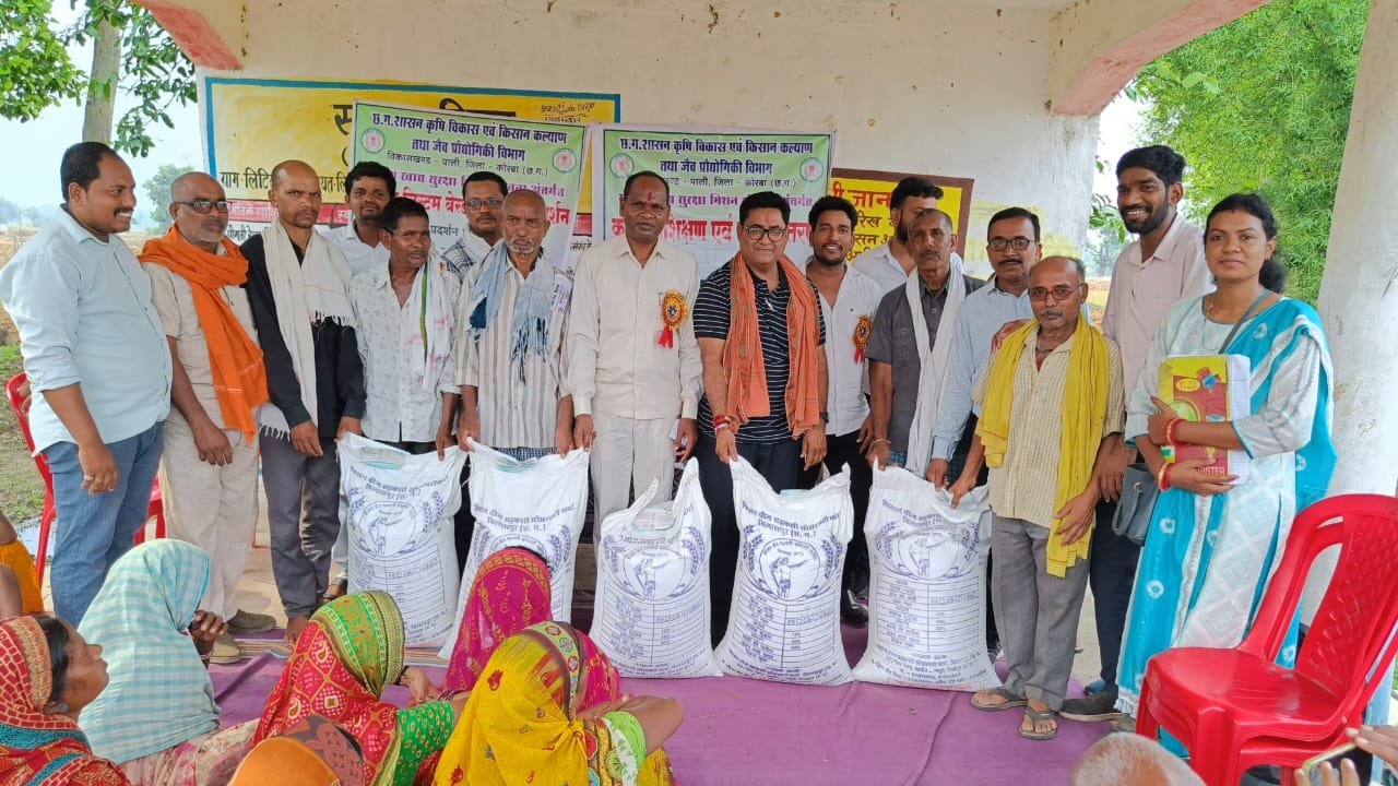 कोरबा । राष्ट्रीय खाद्य सुरक्षा मिशन योजना अंतर्गत राइस ग्राम धान प्रदर्शन हेतु ग्राम लिटियाखार विकासखंड पाली जिला कोरबा में प्रेमचंद पटेल विधायक विधानसभा कटघोरा छत्तीसगढ़ शासन की विशेष आतिथ्य और ग्राम पंचायत सरपंच की अध्यक्षता में बीज वितरण एवम प्रशिक्षण कार्यक्रम आयोजित किया गया। जिसमें विधायक द्वारा कार्यक्रम में उपस्थित कृषकों को केंद्र प्रवर्तित राष्ट्रीय खाद्य सुरक्षा मिशन योजना के महत्त्व और राइस ग्राम प्रदर्शन के उद्देश्य बताते हुए ” उत्तम खेती,मध्यम बान, अधम चाकरी” दोहे के माध्यम से किसानों को उन्नत खेती करने की सलाह दिया गया।आज के कार्यक्रम में प्रदर्शन हेतु चयनित किसानों को विधायक श्री पटेल द्वारा बीज वितरण किया गया।कार्यक्रम में हरीश थदवानी, रमेश कुमार कवर ग्राम पंचायत सरपंच, छतराम यादव, मन्नू राठौर, सानिध्य सोलंकी, शिव यादव,नरेंद्र यादव,छतलाल यादव, नरेंद्र चौहान, महिला समूह लिटियाखार कृषकगण एवम जी पी डिक्सेना वरिष्ठ कृषि विकास अधिकारी पाली एम एस गोंड, बी एस मरावी और श्रीमती चैनबाई ग्रामीण कृषि विस्तार अधिकारी कार्यक्रम में उपस्थित थे।