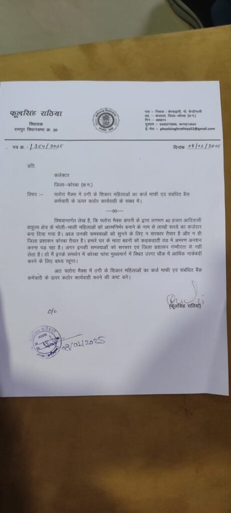 फ्लोरा मैक्स कंपनी से ठगी गई महिलाएं तानसेन चौक पर प्रदर्शन कर आवाज बुलंद की जा रही है। ज्ञापन व गुहार के बाद भी उनकी मांग पर संज्ञान नहीं लिए जाने से महिलाओं में आक्रोश व्याप्त है। तानसेन चौक पर महिलाएं आमरण अनशन पर बैठी हुई हैं। फ्लोरा मैक्स से ठगी की शिकार महिलाओं की कर्ज माफी एवं संबंधित बैंक कर्मचारी के ऊपर कठोर कार्यवाही को लेकर रामपुर विधायक फूलसिंह राठिया ने कलेक्टर को ज्ञापन सौंपा है। इस दौरान सभा स्थल पर महिलाओं को संबोधित करते हुए श्री राठिया ने कहा कि महिलाओं के साथ जब इस तरह की धोखाधड़ी हो रही थी तो शासन, प्रशासन और पुलिस ने क्यों नहीं रोका। क्यों महिलाओं को आगाह नहीं किया। उन्होंने कहा कि हम जब बैंक से लोन लेने जाते हैं तो हमसे तरह-तरह के कागजात मांगे जाते हैं। कई स्तर की जांच की जाती है, और वहीं दूसरी ओर महिलाओं को एक नहीं चार-पांच बैंकों से बिना सत्यापन की लोन दे दिया गया। इसमें फाइनेंस बैंकों की भी मिलीभगत है। कलेक्टर को सौंपे ज्ञापन में विधायक ने कहा है कि फ्लोरा मैक्स कंपनी के द्वारा लगभग 40 हजार आदिवासी बाहुल्य क्षेत्र की भोली-भाली महिलाओं को आत्मनिर्भर बनाने के नाम से लाखों रूपये का कर्जदार बना दिया गया है। आज उनकी समस्याओं को सुनने के लिए न सरकार तैयार है और न ही जिला प्रशासन तैयार है। हमारे घर की माता बहनों को कड़कड़ाती ठंड में अमरण अनशन करना पड़ रहा है। अगर इनकी समस्याओं को सरकार एवं जिला प्रशासन गंम्भीरता से नहीं लेता है तो मैं इनके समर्थन में कोरबा चांपा मुख्यमार्ग में स्थित उरगा चौक में आर्थिक नाकेबंदी करने के लिए बाध्य रहूंगा। उन्होंने कहा कि फ्लोरा मैक्स में ठगी के शिकार महिलाओं का कर्ज माफी एवं संबंधित बैंक कर्मचारी के ऊपर कठोर कार्यवाही होनी चाहिए।