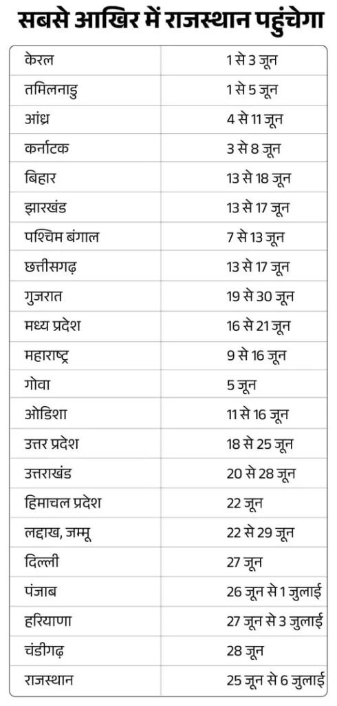 IMD के अनुसार, मानसून के मध्य प्रदेश में 16 से 21 जून और राजस्थान में 25 जून से 6 जुलाई तक पहुंचने के आसार हैं। वहीं यूपी में 18 से 25 जून और बिहार-झारखंड में 18 जून तक पहुंच जाएगा।