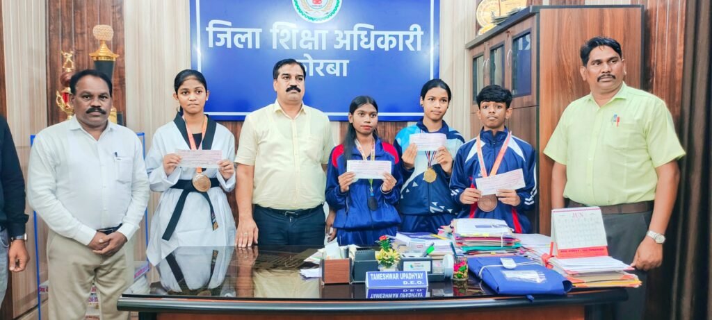 कोरबा। राष्ट्रीय शालेय क्रीड़ा प्रतियोगिता में कोरबा जिले के पदक प्राप्त राष्ट्रीय खिलाड़ियों को आज जिला प्रशासन के निर्देशानुसार तामेश्वर उपाध्याय जिला शिक्षा अधिकारी कोरबा ने तुलसी मानिकपुर पिता स्व श्री नयनदास मानिकपुरी नेटबाल बालिका 19वर्ष शा उमावि विद्या. पी डब्ल्यू डी रामपुर कोरबा ने 67वीं राष्ट्रीय खेल रेवारी हरियाणा में तृतीय स्थान प्राप्त कर ब्रांज मेंडल, कु झिलमिल ठाकुर पिता स्व श्री राजेन्द्र सिंह ठाकुर शा पू मां शा पी डब्ल्यू डी रामपुर कोरबा ने नेटबाल बालिका 14वर्ष 68वीं राष्ट्रीय खेल कोरबा छत्तीसगढ़ में गोल्ड मेडल प्राप्त किया तथा कु . पूर्वी कंवर पिता राम लखन कंवर ब्रिलियंट पब्लिक स्कूल कोरबा ने ताइक्वांडो बालिका 14वर्ष में 68वीं राष्ट्रीय खेल विदिशा मध्य प्रदेश से प्रथम स्थान प्राप्त कर गोल्ड मेडल प्राप्त किया एवं वेदांत कश्यप पिता नरेश कश्यप डीपीएस बालको नगर ने ताइक्वांडो 14वर्ष बालक वर्ग में 68 वीं राष्ट्रीय शालेय खेल प्रतियोगिता विदिशा मध्य प्रदेश से तृतीय स्थान ब्रांज मेंडल प्राप्त किया। जिन्हें छत्तीसगढ़ शासन के आदेशानुसार लोक शिक्षण संचालनालय नवा रायपुर के द्वारा कु तुलसी मानिकपुरी को 10000 , कु. झिलमिल ठाकुर को 21000 , पूर्वी कंवर 21000 , वेदांत कश्यप को 10000 का बैंक ड्राफ्ट जिला शिक्षा अधिकारी कोरबा के द्वारा प्रदान किया। श्री उपाध्याय ने कहा इस प्रकार से खेलो में भाग लेकर जिला एवं राज्य का नाम रोशन करते रहे।