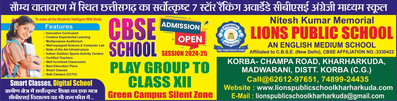 कोरबा। ग्राम खरहरकुड़ा मड़वारानी में संचालित सीबीएसई विद्यालय नितेश कुमार मेमोरियल लायंस पब्लिक स्कूल के छात्रों ने इस सत्र दसवीं एवं बारहवीं की बोर्ड परीक्षा में उत्कृष्ट अंक प्राप्त कर विद्यालय एवं क्षेत्र का नाम रोशन किया। उक्त विद्यालय के छात्रों ने दसवीं एवं बारहवीं की बोर्ड परीक्षा में शत प्रतिशत रिजल्ट बनाया। विद्यालय के प्राचार्य दीपक जायसवाल ने बताया कि सत्र 2023-24 की दसवीं बोर्ड परीक्षा में रीतु चौबे ने प्रथम स्थान, कुनाल अग्रवाल ने द्वितीय स्थान एवं मिलिंद साहू ने तृतीय स्थान प्राप्त किया । वहीं बारहवीं की बोर्ड परीक्षा में कुमारी ममता कंवर ने प्रथम स्थान, राजा पटेल द्वितीय स्थान एवं अनिमेश अग्रवाल ने तृतीय स्थान प्राप्त किया।