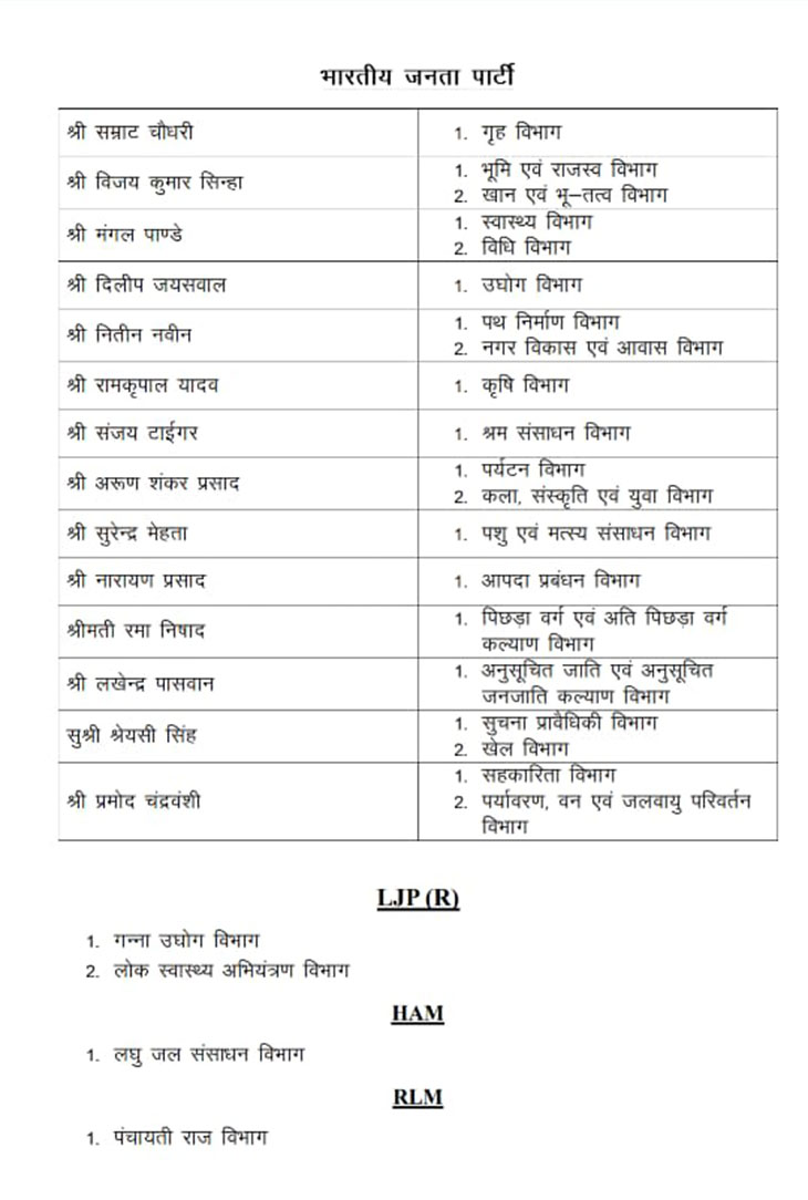 शाम करीब 5 बजे नीतीश कुमार और सम्राट चौधरी लिस्ट लेकर राजभवन पहुंचे। 5.15 बजे लिस्ट जारी कर दी गई।
