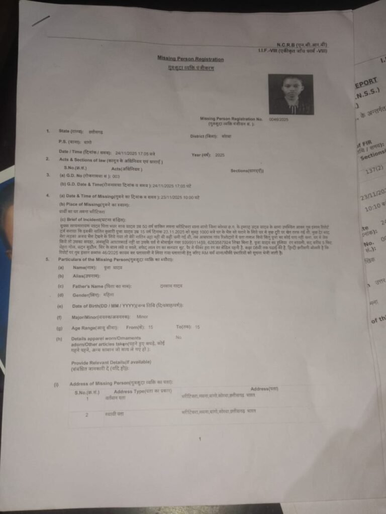 कोरबा। जिले के बांगो थाना क्षेत्र अंतर्गत ग्राम लमना भरीटीकरा से 27 दिनों पूर्व लापता हुई नाबालिग पूजा यादव का अब तक कोई सुराग नहीं मिल पाया है। परिजनों की रिपोर्ट पर पुलिस ने गुम इंसान क्रमांक 46/2025 दर्ज कर मामले की जांच शुरू कर दी है, लेकिन लंबा समय बीत जाने के बावजूद बच्ची का पता नहीं चल सका है, जिससे परिजन गहरे चिंतित हैं।