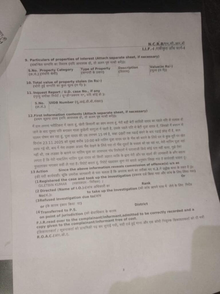 परिजनों ने बताया कि बाद में पूजा का मामा अजय भैंस को देखने खेत गया, जहां भैंस तो मिल गई लेकिन पूजा वहां मौजूद नहीं थी। इसके बाद आसपास के गांवों, रिश्तेदारों और परिचितों के यहां काफी तलाश की गई, लेकिन पूजा का कहीं कोई पता नहीं चला।