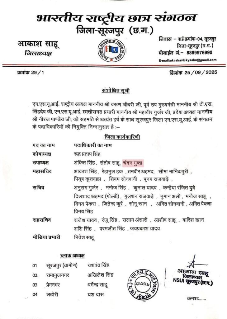 एनएसयूआई सूरजपुर ने की कार्यकारणी की घोषणा , चंदन गुप्ता बने जिला उपाध्यक्ष