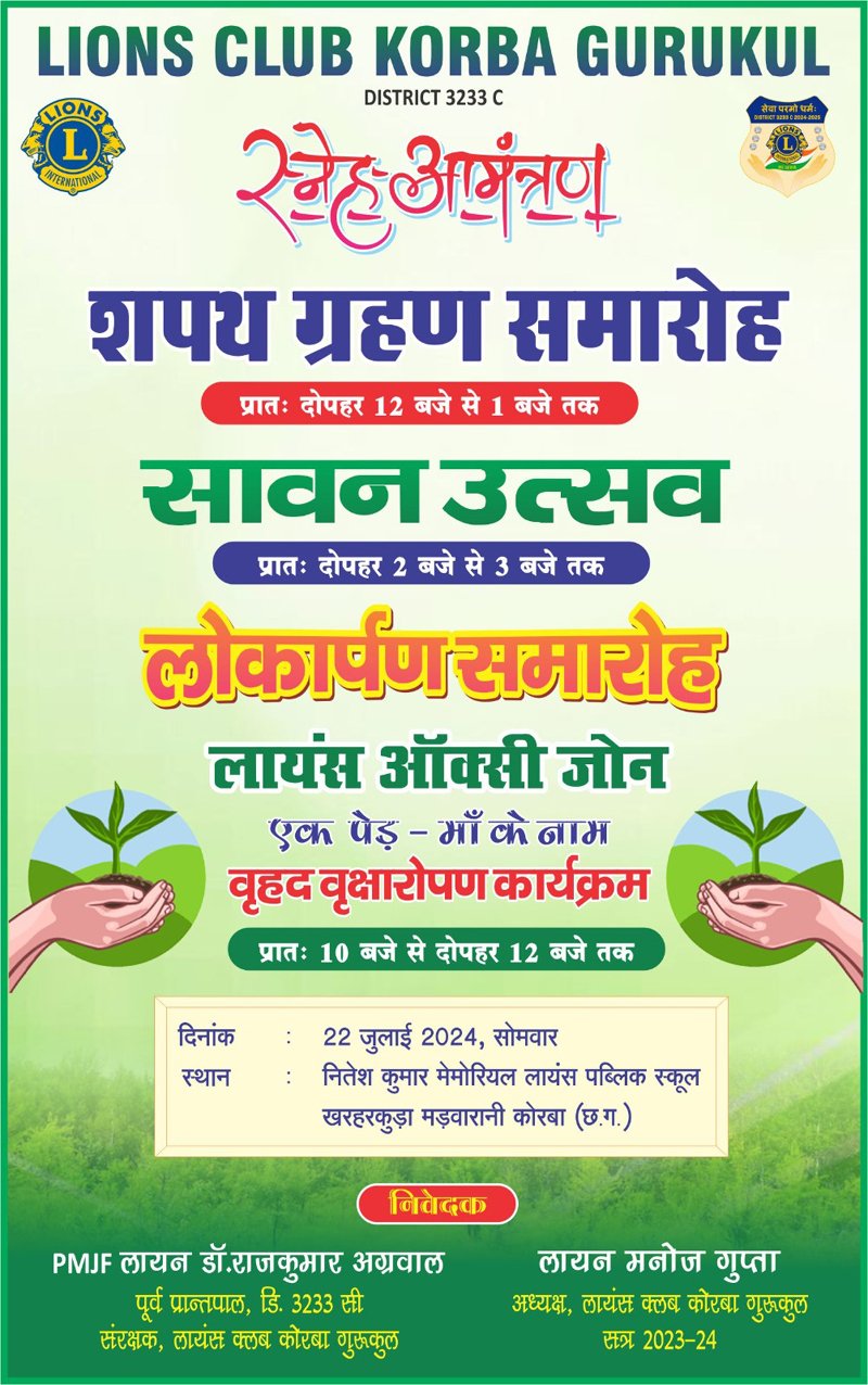 उक्त कार्यक्रमों के संबंध में कार्यक्रम संयोजक एवं विद्यालय के चेयरमेन पीएमजेएफ लायन डॉ. राजकुमार अग्रवाल ने जानकारी दी कि प्रतिवर्ष क्लब एवं विद्यालय परिवार द्वारा पर्यावरण संरक्षण हेतु वृहद वृक्षारोपण कार्यक्रम का आयोजन किया जाता रहा है। इस वर्ष शासन द्वारा चलाये जा रही योजना एक पेड़ मां के नाम अभियान के तहत् विद्यालय परिसर में 1100 पौधे लगाये जाने का लक्ष्य रखा गया है। इसके लिए लायंस क्लब कोरबा गुरूकुल द्वारा विद्यालय की भूमि पर अध्ययनरत् विद्यार्थियों एवम सदस्यों द्वारा पौधे लगाये जायेंगे जिनकी पूरी देखभाल क्लब और विद्यालय परिवार द्वारा की जायेगी। जिस स्थान पर विद्यार्थियों द्वारा पौधारोपण किया जायेगा। उस स्थान को लायंस ऑक्सि जोन के नाम से संचालित किया जायेगा। यह क्लब की एक नयी स्थायी सेवा गतिविधि कही जायेगी। जहांॅ पौधारोपण के बाद पौधों को सही तरह से देखरेख की जायेगी। वृक्षारोपण पश्चात् लायंस क्लब कोरबा गुरूकुल की नवीन कार्यकारिणी के पदाधिकारियों के शपथ ग्रहण समारोह का आयोजन किया गया है। जिसमें सत्र 2024-25 के नव निर्वाचित अध्यक्ष एमजेएफ लायन पवन अग्रवाल (ऑटो सेन्टर) अपनी टीम के साथ विधिवत शपथ ग्रहण करेंगे। शपथ ग्रहण पश्चात् लायंस क्लब की महिला सदस्यों के लिए सावन उत्सव का आयोजन किया गया है।