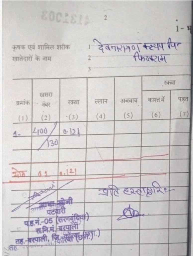 ननकीराम पिता जतीराम-सण्डैल, अमृतलाल पिता जतीराम-सण्डैल, कीर्तनलाल पिता फिरतराम, देवनारायण पिता फिरतराम-सण्डैल, मेघराज पिता रिखीराम-सण्डैल, सत्यनारायण पिता रोहितराम, विनोद कुमार पिता मेघराज एवं उसकी पत्नी अहिल्याबाई पति विनोद कुमार, अमिल बिंझवार पिता इतवार एवं उसकी पत्नी मिलौतिन बाई पति अमिल बिंझवार, कविता कश्यप पति रामकिर्तन, जयकिशन चौकसे पिता खीकराम चौकसे शामिल हैं। पटवारी और तहसीलदार ने एक से डेढ़ एकड़ तक नाम दर्ज कर दिया।
