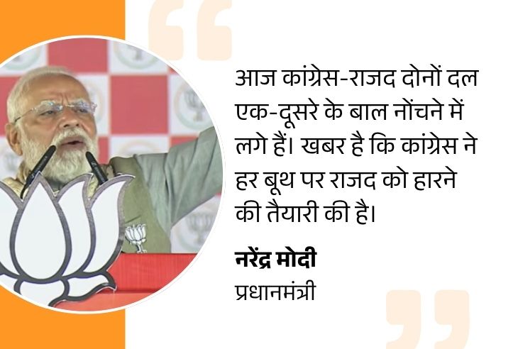 PM ने नवादा की सभा में कहा, ‘जंगलराज वाले-कांग्रेस वाले आपके हक का सारा पैसा लूट कर अपनी तिजोरी भरते हैं। ये मैं नहीं कह रहा, कांग्रेस के पीएम ने कहा था- अगर मैं 1 रुपए भेजता हूं, तो वो लाभार्थी के पास पहुंचते-पहुंचते 15 पैसा हो जाता है। ये कौन-सा पंजा था, जो पैसे खा जाता था।’