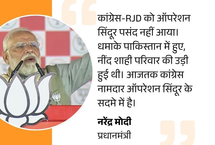 - छठ का अपमान करने वालों को मत भूलिएगा: आपने देखा है कि आपका ये बेटा तो छठी मैया की जय-जयकार दुनिया में कराने में लगा है। दूसरी तरफ ये कांग्रेस और RJD के लोग छठी मैया का अपमान कर रहे हैं। क्या ऐसा अपमान, बिहार, हिंदुस्तान और मेरी माताएं जो निर्जला उपवास करती हैं, वो सहन कर सकती हैं। क्या बिहार की माताएं-बहनें छठी मैया का ये अपमान बर्दाश्त करेंगी। मैं जानता हूं कि छठी मैया के इस अपमान को बिहार का कोई भी व्यक्ति नहीं भूलेगा।