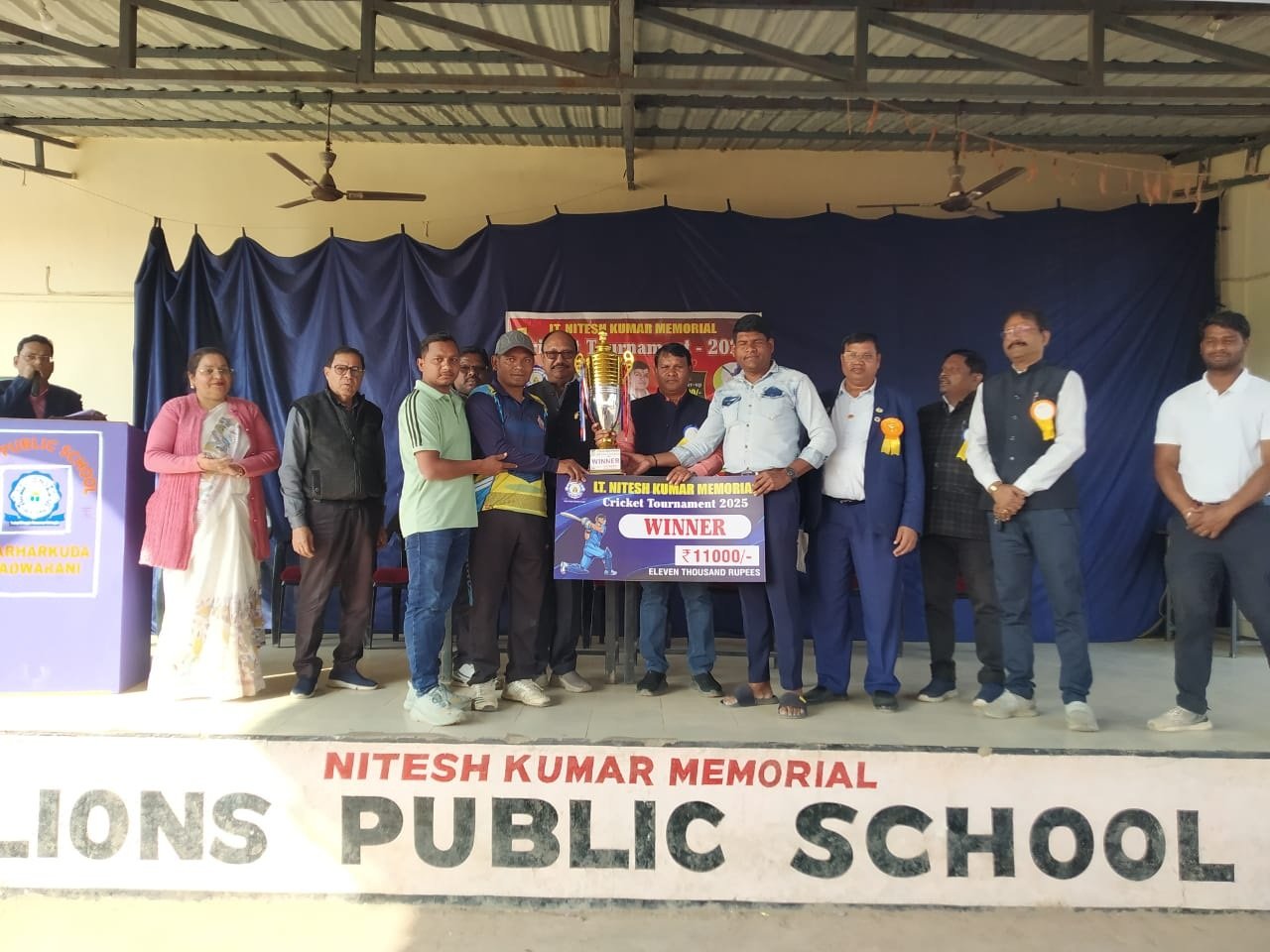 कोरबा/मड़वारानी। नितेश कुमार मेमोरियल टूर्नामेंट का आज फायनल रोमांचक मैच नितेश कुमार मेमोरियल लायंस पब्लिक स्कूल खरहरकुड़ा के विशाल खेल मैदान में खेला गया। मुख्य अतिथि जिला पंचायत अध्यक्ष डॉ. पवन सिंह, विशिष्ट अतिथि संजय राठौर, विद्यालय के चेयरमेन लायन राजकुमार अग्रवाल सहित अतिथियों, ग्रामीणों, अभिभावकों एवं विद्यालय के बच्चों ने फायनल मैच देखा। एक पखवाड़े से चल रही क्रिकेट टूर्नामेंट का आज समापन हो गया और इस रोमांचक मुकाबले में पुलिस लाईन ने फायनल मैच अपने नाम कर लिया।