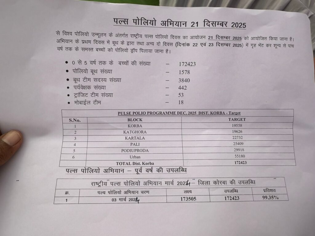 जिले भर में 0 से 05 वर्ष के बच्चों की संख्या 01 लाख 72 हजार 423 है और सभी को ड्राप्स पिलाने का लक्ष्य रखा गया था, इसके लिए जिले भर में 1578 पोलियो बूथ बनाए गए थे जिसमें सुबह से लेकर शाम तक 3840 बूथ टीम सदस्य अपने-अपने बूथों में जाकर पोलियो ड्राप्स पिलाने सक्रिय रहे। कार्यक्रम को शत-पतिशत सफल बनाने के लिए 442 पर्यवेक्षक भी नियुक्त किए गए थे। 53 ट्रांजिट टीम भी बनाई गई थी और जिले भर में 18 मोबाईल टीम भी सेवारत थी।