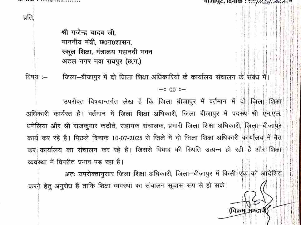 मंडावी ने इस मामले को लेकर राज्य के शिक्षा मंत्री गजेंद्र यादव को पत्र भी लिखा है। पत्र में उन्होंने उल्लेख किया है कि वर्तमान में बीजापुर में एन.एल. धनेलिया जिला शिक्षा अधिकारी के रूप में पदस्थ हैं, वहीं राजकुमार कठौते सहायक संचालक और प्रभारी जिला शिक्षा अधिकारी के रूप में कार्य कर रहे हैं।
