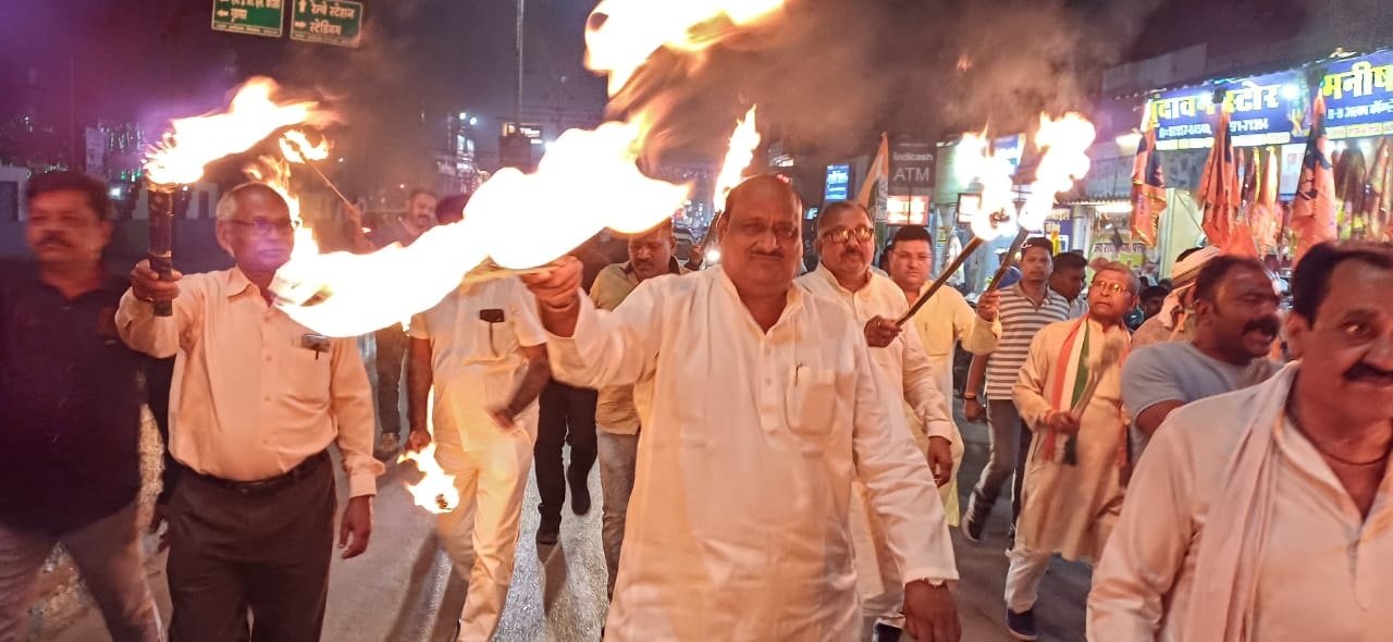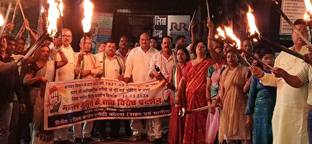 विरोध प्रदर्शन:कांग्रेस को आयकर विभाग द्वारा 1823 करोड़ जमा करने का नोटिस देने के खिलाफ कोरबा कांग्रेस मशाल लेकर उतरी सड़क पर