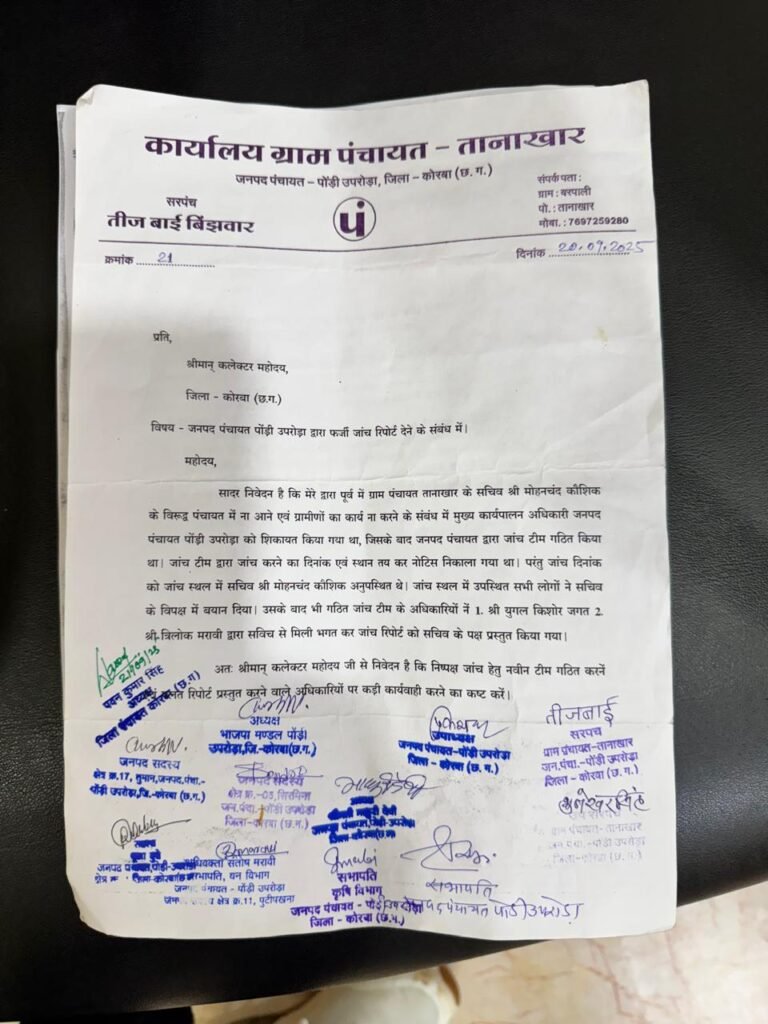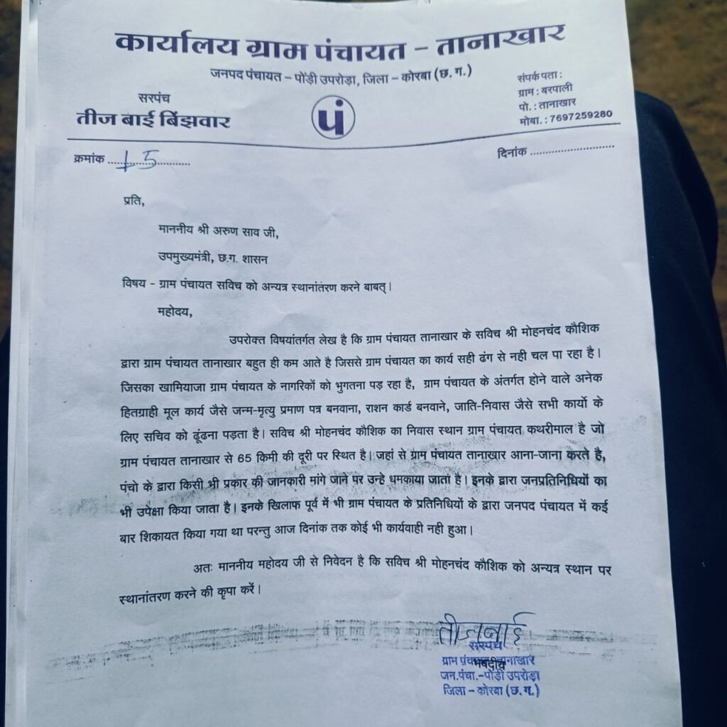 कोरबा/तानाखार। कोरबा जिले के विकासखण्ड पोड़ी-उपरोड़ा अंतर्गत ग्राम पंचायत तानाखार के सचिव मोहनचंद्र कौशिक के नदारद रहने से कई मूलभूत, प्राथमिक एवं बुनियादी कार्यों के लिए जनता परेशान है और उन्हें हटाने के लिए सरपंच तीजबाई सहित जनप्रतिनिधियों ने पंचायत मंत्री एवं जिला कोरबा के प्रभारी मंत्री अरूण साव को ज्ञापन सौंपा है।