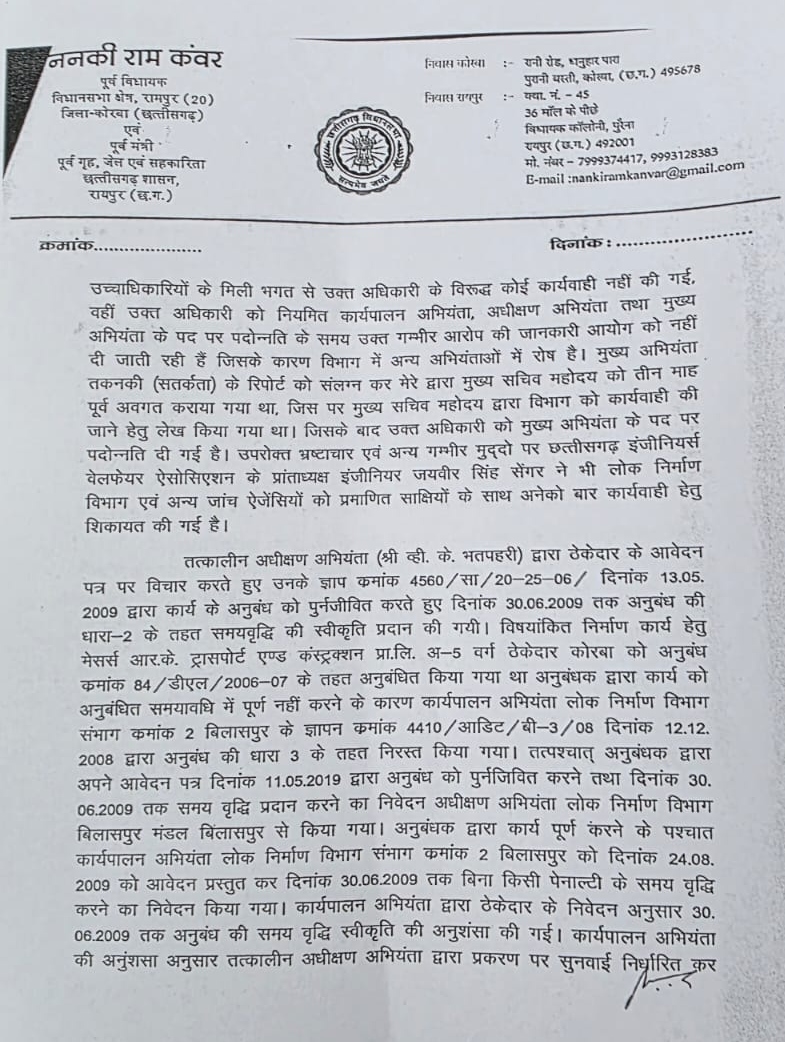 Divya Akashकोरबा। पूर्व गृहमंत्री ननकी राम कंवर ने प्रधानमंत्री नरेंद्र मोदी, मुख्य सचिव विकासशील और PWD सचिव कमलप्रीत सिंह को पत्र लिखकर लोक निर्माण विभाग के चीफ इंजीनियर विजय कुमार भतपहरी की शिकायत की है। उन्होंने विजय भतपहरी पर भ्रष्टाचार के आरोप लगाए हैं।