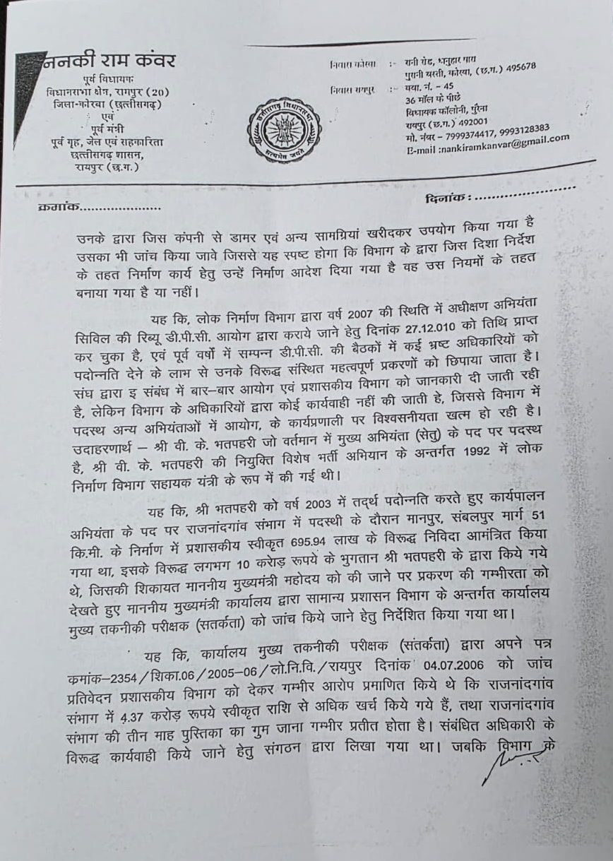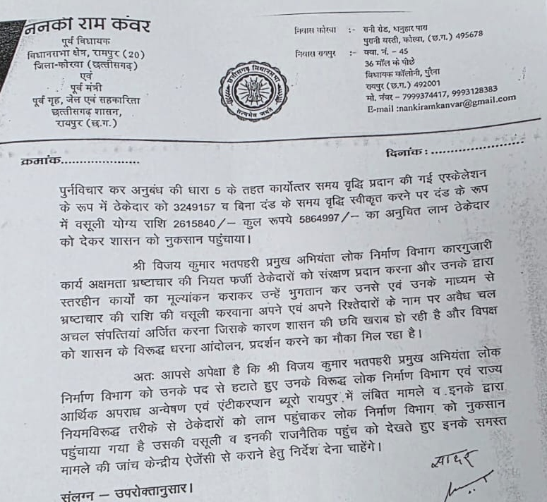 ननकी राम कंवर ने पत्र में मांग की है कि विजय कुमार भतपहरी को तत्काल उनके पद से हटाया जाए, सभी लंबित मामलों की CBI से जांच कराई जाए और लोक निर्माण विभाग को हुए कथित वित्तीय नुकसान की वसूली सुनिश्चित की जाए।