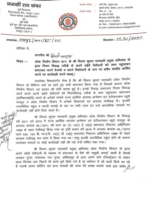ननकी राम कंवर ने अपने पत्र में आरोप लगाया है कि विजय कुमार भतपहरी ने अलग-अलग पदों पर रहते हुए नियमों की अनदेखी कर अपने चहेते ठेकेदारों को गलत तरीके से फायदा पहुंचाया। उन्होंने मामले की निष्पक्ष और गहन जांच के लिए केंद्रीय अन्वेषण ब्यूरो (CBI) से जांच कराने की मांग की है।