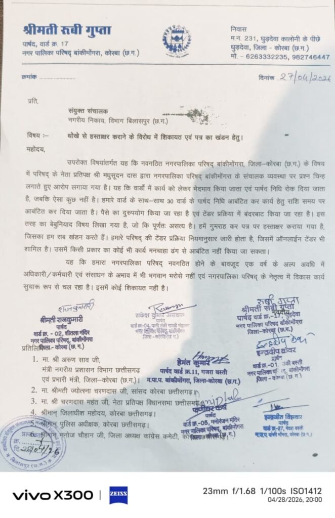 बाँकी मोंगरा :– बीते दिनांक 21/4 को नेता प्रतिपक्ष मधुसूदन दास के द्वारा परिषद् एवं बिलासपुर सयुंक्त संचालक को पत्र लिख कर टेंडर में मनमानी एवं परिषद् की कार्यप्रणाली को लेकर शिकायत की गई जिसमें कांग्रेस पार्षदों के हस्ताक्षर भी कराए गए थे, पर कांग्रेसी पार्षदों ने कहा कि उस शिकायत पत्र पर हमारे दस्तखत थे पर वो हमसे धोखे से कटाया गया था।