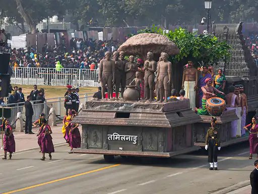 तमिलनाडु की झांकी में वहां के गांव की झलक दिखी। झांकी में सबसे आगे महिलाओं और पुरुषों को दिखाया गया, जो हाथ जोड़े खड़े हैं। उनके आगे एक बच्चा है। इसके अलावा पीछे पेड़ नजर आ रहे हैं। इसमें प्राकृतिक झलक दिखी।