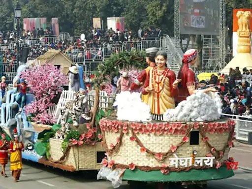 मेघालय की झांकी में सबसे आगे दो महिलाओं और एक पुरुष को दिखाया गया। उनके पीछे एक पेड़ और बाघ और शावक नजर आया। सबसे पीछे गांव की एक झोपड़ी दिखाई गई। वहीं झांकी सुंदर फूलों से सजी रही।