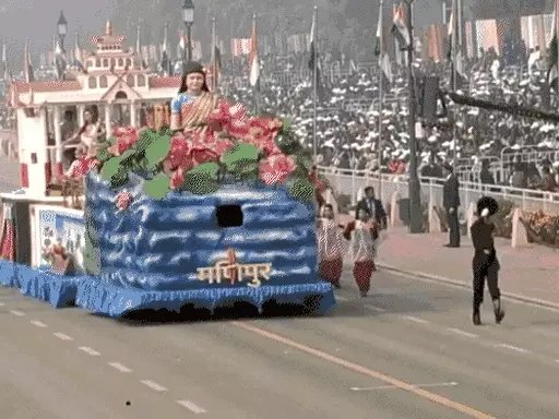 मणिपुर की झांकी में महिलाओं को कमल के तने के नाजुक रेशों से चरखे का उपयोग करके सूत बनाते हुए दिखाया गया। सामने वाले हिस्से में मणिपुर की लोकतक झील है। झांकी में मणिपुर की 500 साल पुरानी इमा कीथल मार्केट भी दिखाई गई