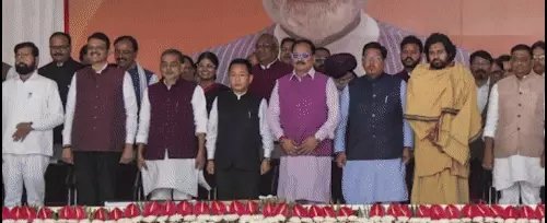 शपथ ग्रहण समारोह में एनडीए सरकार के सीएम और डिप्टी सीएम मंच पर मौजूद थे।