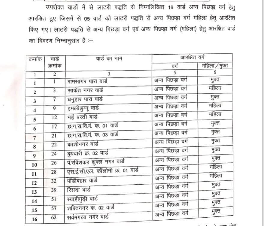 ओबीसी के 16 सीट के लिए वार्ड क्रमांक – 51, 62, 17, 26, 57, 22, 39, 1, 24, 7 और 21 होंगे मुक्त जबकि वार्ड क्रमांक – 12, 9, 32, 28 और 3 होंगे ओबीसी महिलाओं के लिए आरक्षित।