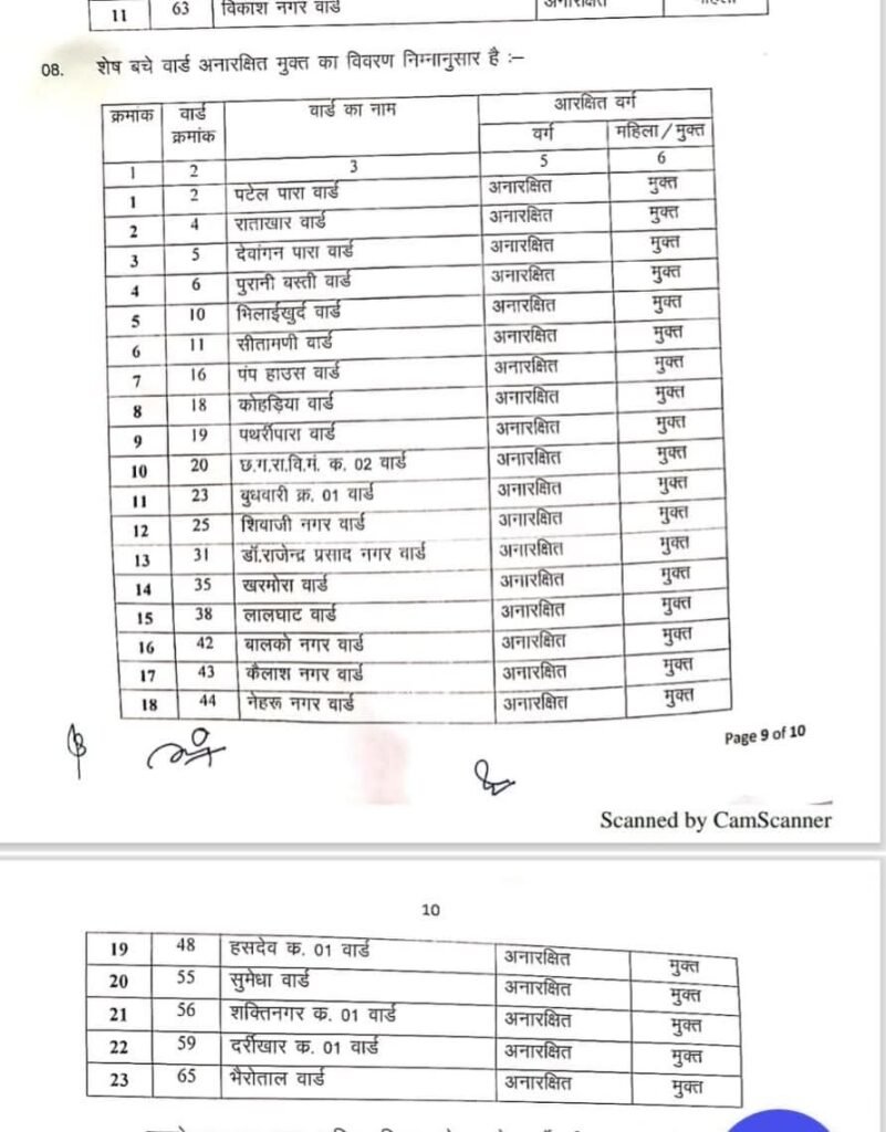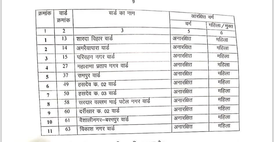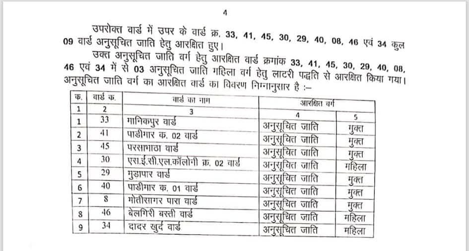 अनुसूचित जाति के 9 सीट – वार्ड क्रमांक- 33, 41, 45, 29, 40 और 8 होंगे मुक्त जबकि वार्ड क्रमांक – 30, 34 और 46 रहेंगे अनुसूचित जाति महिलाओ के लिए आरक्षित।