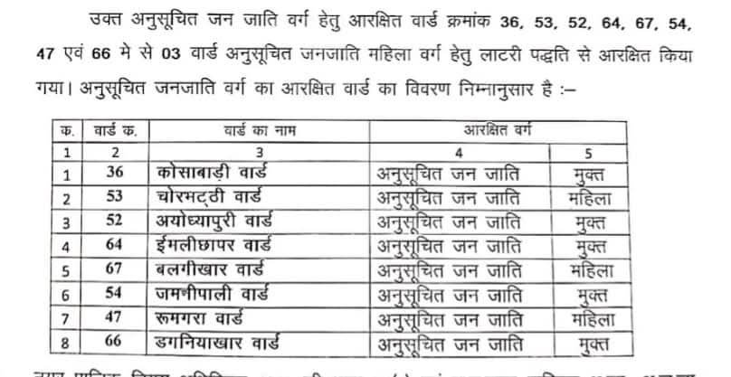 अजजा के 8 सीट- वार्ड क्रमांक- 36, 52, 64, 54, और 66 होंगे मुक्त जबकि वार्ड क्रमांक 67, 47 और 53 अजजा महिलाओ के लिए आरक्षित,