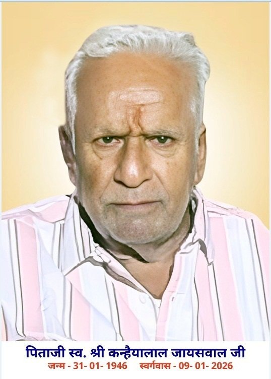 स्वर्गीय श्री कन्हैया लाल जायसवाल के ज्येष्ठ पुत्र, जिला पंचायत कोरबा के पूर्व उपाध्यक्ष अजय जायसवाल ने बताया कि हमारे पिताश्री स्वर्गीय श्री कन्हैया लाल जायसवाल की आत्मशांति के लिए शांतिपाठ 22 जनवरी 2026 दिन गुरूवार को अपराह्न 4.00 बजे डीडीएम रोड स्थित होटल हरिमंगलम में किया गया है।