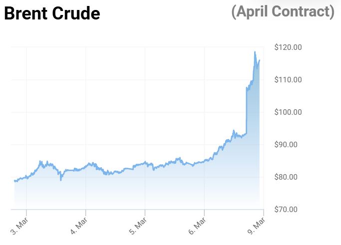अंतरराष्ट्रीय बाजार में कच्चे तेल के दाम साढ़े तीन साल के हाई पर पहुंच गए। आज यानी 9 मार्च को कारोबार के दौरान ये 25% बढ़कर 115 डॉलर प्रति बैरल के पार पहुंच गया।
