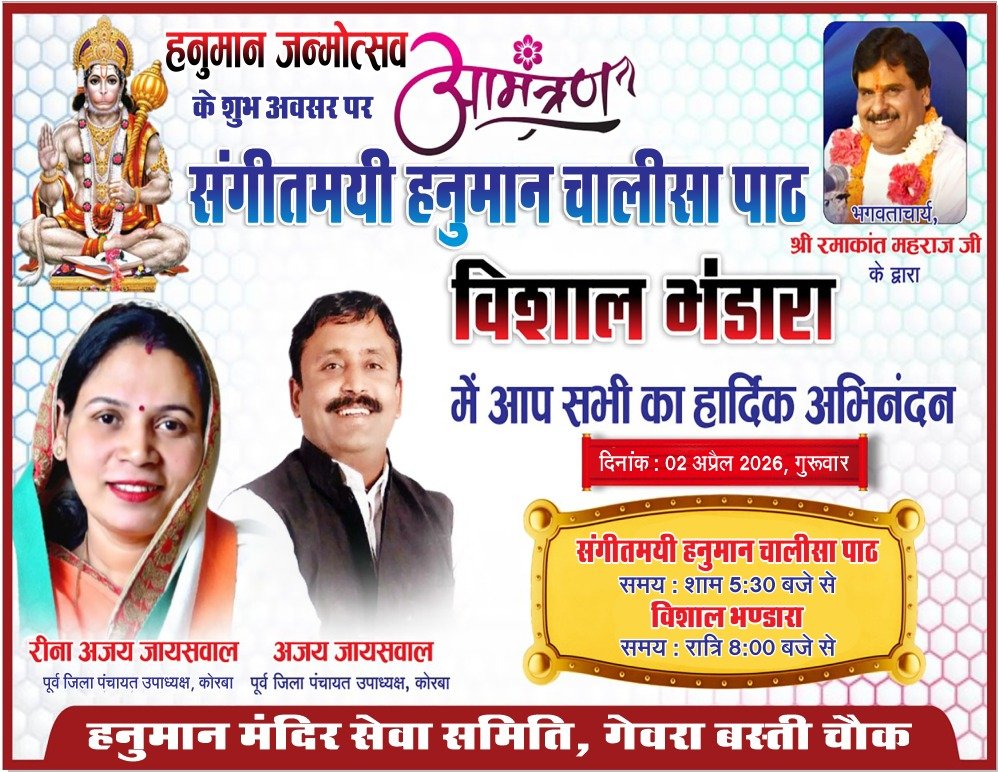 कोरबा। श्री सिद्धेश्वर हनुमान मंदिर, आर.पी. नगर फेज-2 में भगवान श्री हनुमान के पावन जन्मोत्सव के अवसर पर विभिन्न धार्मिक कार्यक्रमों का आयोजन किया जा रहा है।