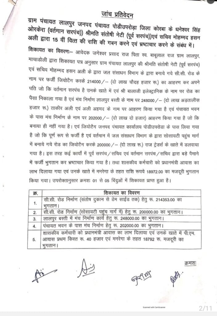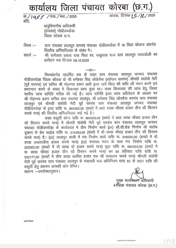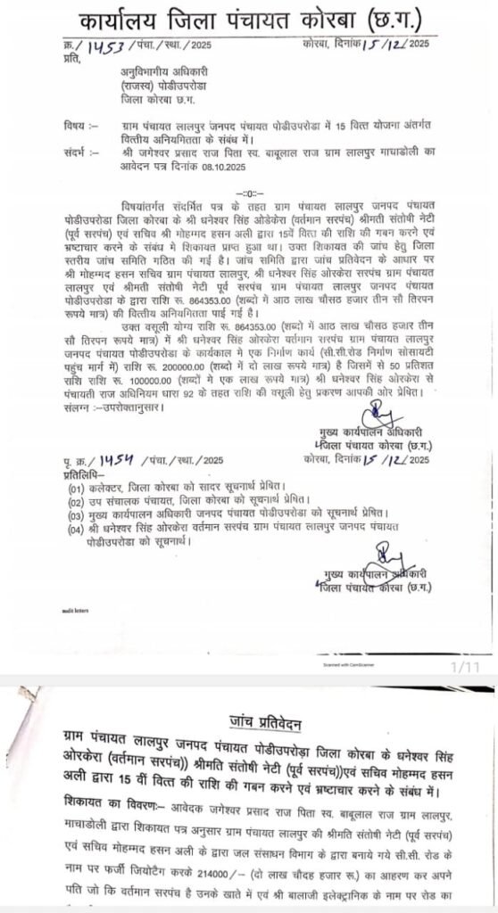 ग्राम पंचायत लालपुर जनपद पंचायत पोड़ी-उपरोड़ा में सचिव मोहम्मद हसन के साथ सरपंच धनेश्वर सिंह ओडेकेरा, पूर्व सरपंच संतोषी नेटी ने 15वें वित्त की राशि का जमकर बंदरबांट किया। सीईओ ने जांच कराई और जांच टीम ने 8 लाख 64 हजार 353 रूपए की अनियमितता पाई।