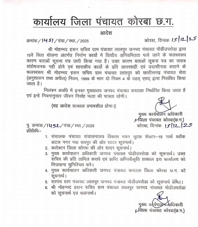 इसी कड़ी में जिले की जनपद पोड़ी-उपरोड़ा अंतर्गत ग्राम पंचायत लालपुर सचिव मोहम्मद हसन को आज जिला पंचायत सीईओ दिनेश नाग ने संस्पेंड कर दिया।