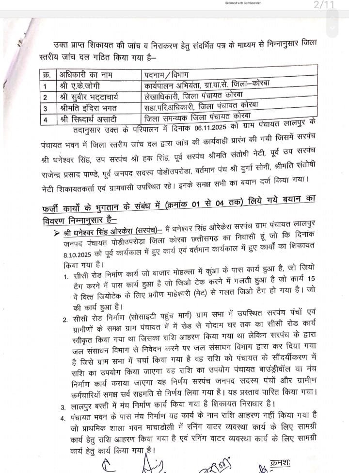 - कोरबा/पोड़ी-उपरोड़ा। जिले की जनपद पंचायत पोड़ी-उपरोड़ा अंतर्गत ग्राम पंचायत लालपुर में गोठान, सीसीरोड, पानी टंकी, चारागाह के लिए भूमि समतलीकरण, फेंसिंग, गड्ढा खुदाई सहित कई कार्यों का फर्जी जियो टेक कर लाखों का बंदरबांट करने का मामला प्रकाश में आया है, इसके पूर्व यहां के ग्रामीणों ने जिला पंचायत सीईओ को ज्ञापन देकर साढ़े आठ लाख के फर्जी आहरण करने की शिकायत की थी, जिस पर जिला पंचायत सीईओ दिनेश नाग के निर्देश पर आरईएस के ईई ए के जोगी की अध्यक्षता में बनी टीम ने जांच प्रारंभ कर दी है।