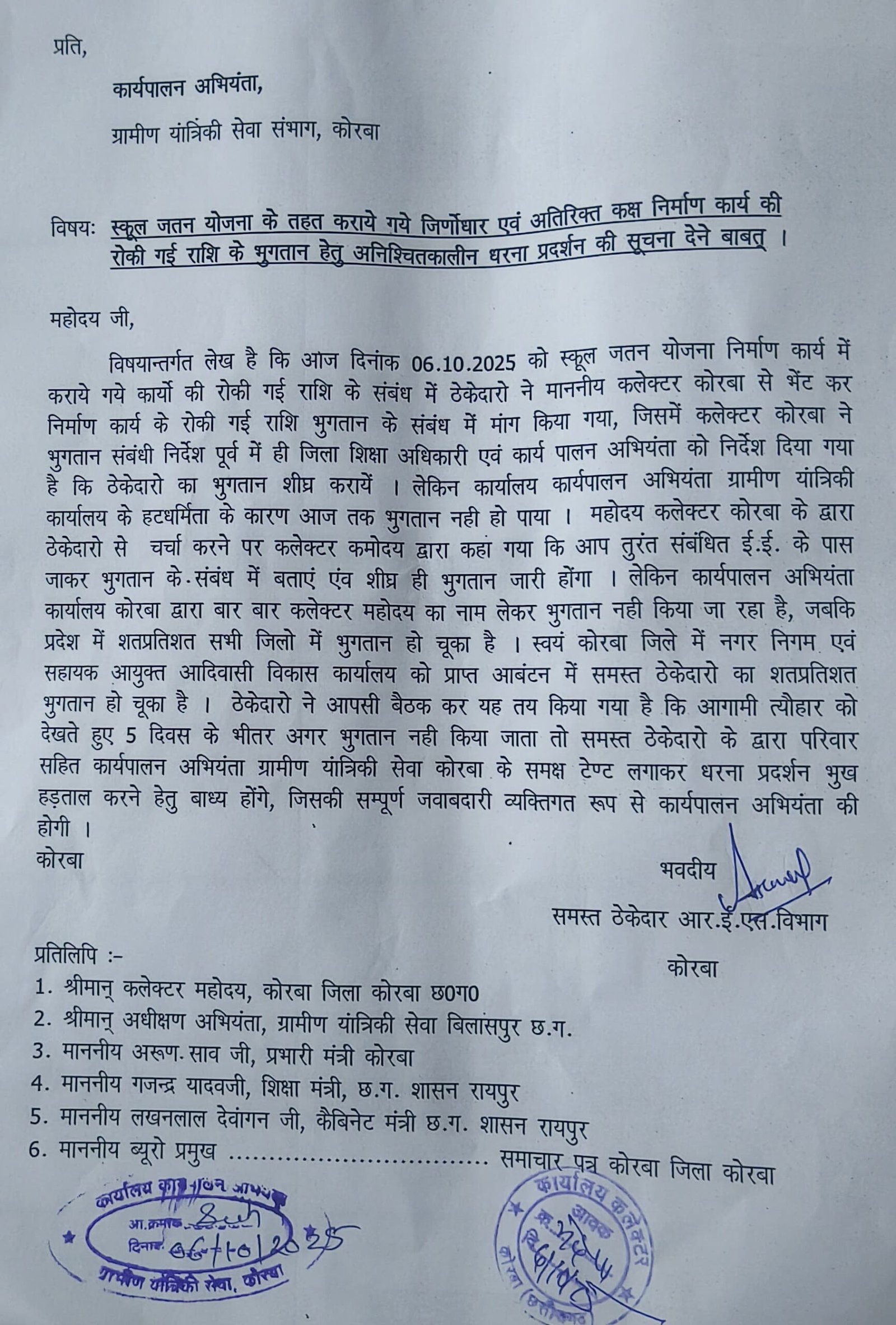 कोरबा। तात्कालीन भूपेश सरकार ने जर्जर स्कूलों की मरम्मत के लिए स्कूल जतन योजना के तहत राशि जारी की थी। कोरबा में भी ठेकेदारों ने स्कूल जतन योजना के तहत स्कूलों की मरम्मत की थी और कार्य पूर्ण हुए तीन साल बीत गए। ठेकेदार कलेक्टर से लेकर रायपुर तक का चक्कर लगा चुके हैं, लेकिन अभी तक पूर्ण भुगतान नहीं हो पाया है, जिसके कारण आरईएस के ठेकेदार आर्थिक मंदी से गुजर रहे हैं। कार्यपालन अभियंता जोगी के खिलाफ ठेकेदारों का आक्रोश भड़क गया और 6 अक्टूबर को जोगी को ज्ञापन सौंपकर अल्टीमेटम दिया है कि स्कूल जतन योजना के तहत विभाग द्वारा कराए गए जीर्णोद्धार एवं अतिरिक्त कक्ष निर्माण की रोकी गई राशि 5 दिन के अंदर भुगतान करें, नहीं तो कार्यालय के सामने अनिश्चित कालीन धरना प्रदर्शन किया जाएगा।