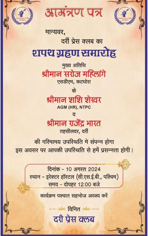 कोरबा/ दर्री। दर्री प्रेस क्लब की नई कार्यकारिणी का शपथ समारोह 10 अगस्त को सीएसईबी-पश्चिम एचटीपीपी दर्री के इरेक्टर हॉस्टल के सभागार में दोपहर 12 बजे से होगा। शपथ समारोह में मुख्य अतिथि के रूप में कटघोरा एसडीएम सरोज महिलांगे उपस्थित रहेंगे। विशिष्ट अतिथि के रूप में एजीएम (एचआर) एनटीपीसी शशि शेखर एवं दर्री तहसीलदार राजेन्द्र भारत विशेष रूप से उपस्थित रहेंगे। इनके अलावा अन्य अतिथि भी उपस्थित रहेंगे।