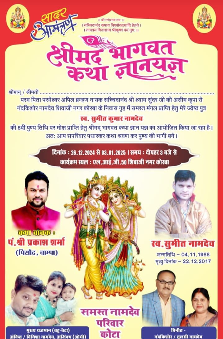 कोरबा।नामदेव परिवार द्वारा श्रीमद्भागवत कथा ज्ञानयज्ञ का आयोजन दिनांक २६ दिसंबर २०२४ से ०३ जनवरी २०२५ तक किया जा रहा है। यह दिव्य कथा वाचन कार्यक्रम प्रत्येक दिन दोपहर ०३:०० बजे से आयोजित होगा। कथा के वाचक श्री प्रकाश शर्मा पिसौद (चांपा) जी होंगे, जिनकी कथाओं में गूढ़ आत्मज्ञान और श्री कृष्ण की लीलाओं का अद्भुत वर्णन होता है।