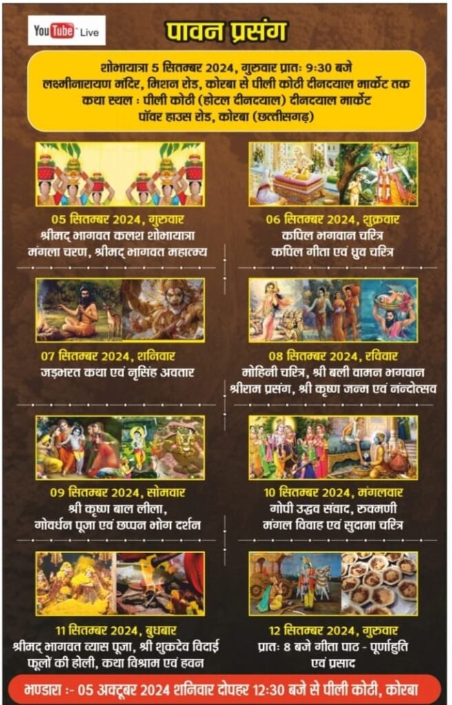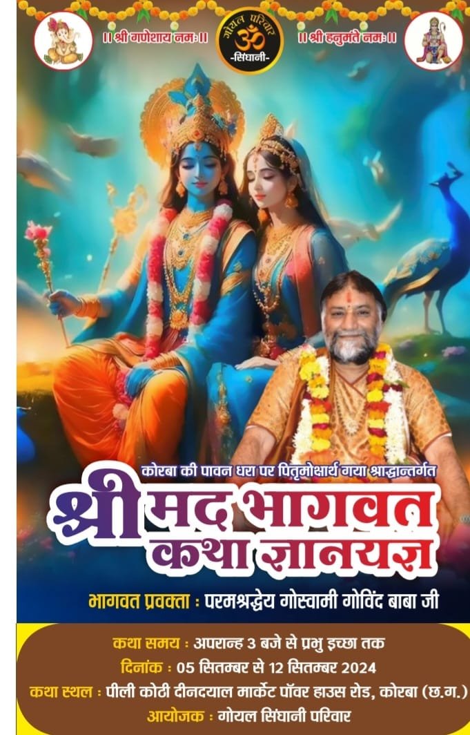कोरबा । गोयल सिंघानी परिवार द्वारा 05 सितंबर से 12 सितंबर 2024 तक पीली कोठी, दीनदयाल मार्केट पॉवरहाउस रोड कोरबा में श्रीमद् भागवत कथा ज्ञान यज्ञ का आयोजन किया जा रहा है। 05 सितंबर को प्रात: भव्य कलश शोभायात्रा निकाली जाएगी और दोपहर 03 बजे से मंगलाचरण, श्रीमद् भागवत महात्म्य के साथ श्रीमद् भागवत कथा प्रारंभ होगी। भागवत प्रवक्ता गोस्वामी गोविंद बाबा के श्रीमुख से 05 से 12 सितंबर तक श्रीमद् भागवत कथा का वाचन किया जाएगा। आयोजक सदस्य पवन अग्रवाल ने बताया कि यह कथा 05 सितंबर से 11 सितंबर तक चलेगी और कथा को विराम दिया जाएगा। अंतिम दिन 12 सितंबर को प्रात: 08 बजे गीता पाठ, पूर्णाहूति एवं प्रसाद वितरण के साथ यह आध्यात्मिक कार्य भगवताचार्य श्री गोविंद बाबा द्वारा संपन्न कराया जाएगा। पवन अग्रवाल ने श्रद्धालुओं से विनम्र अपील करते हुए कथा का रसपान करने सादर आमंत्रित किया है।
