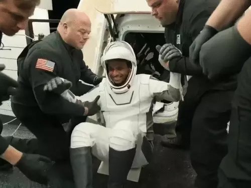 पृथ्वी पर वापसी के बाद ड्रैगन स्पेसक्राफ्ट को पानी से निकाला गया।