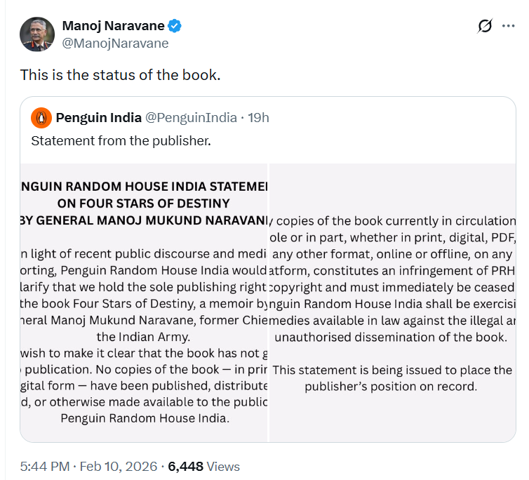 इसके जवाब में राहुल गांधी ने मंगलवार को कहा- या तो नरवणे झूठ बोल रहे हैं, या पेंगुइन कंपनी। वहीं कंपनी के बयान को पूर्व आर्मी चीफ ने X पर रीपोस्ट किया। उन्होंने लिखा- यह है बुक पर स्थिति।