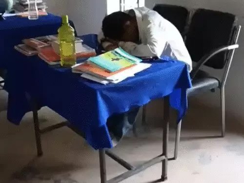 टेबल पर सिर रखकर शिक्षक सोते दिखे।