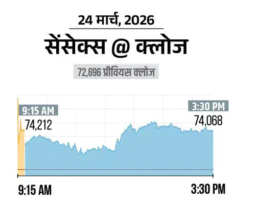 सेंसेक्स 1372 अंक चढ़कर 74,068 पर बंद:निफ्टी में भी 400 अंकों की तेजी, बैंकिंग और ऑटो सेक्टर के शेयरों में सबसे ज्यादा खरीदारी